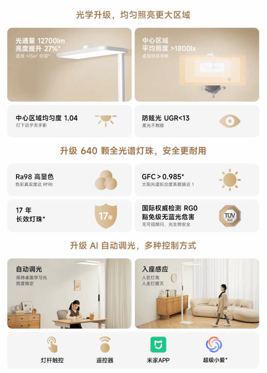产品提供常规、氛围、观屏三种照明模式,支持灯杆触控、遥控器、米家 APP、超级小爱四种控制方式,还可开启专注模式与低亮夜灯模式,上下光源支持独立开关。
