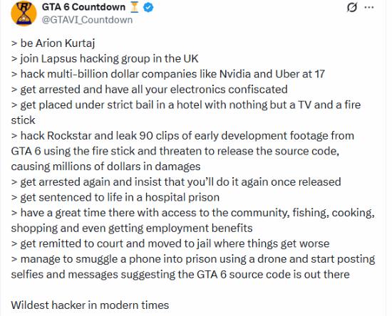 近期博主GTAVI_Countdown表示有消息显示,他通过无人机将手机走私入狱,并且在狱中发布自拍与相关信息,暗示GTA6源代码仍在可接触范围内。这一连串行为让他被不少网友称为现代最疯狂的黑客之一。