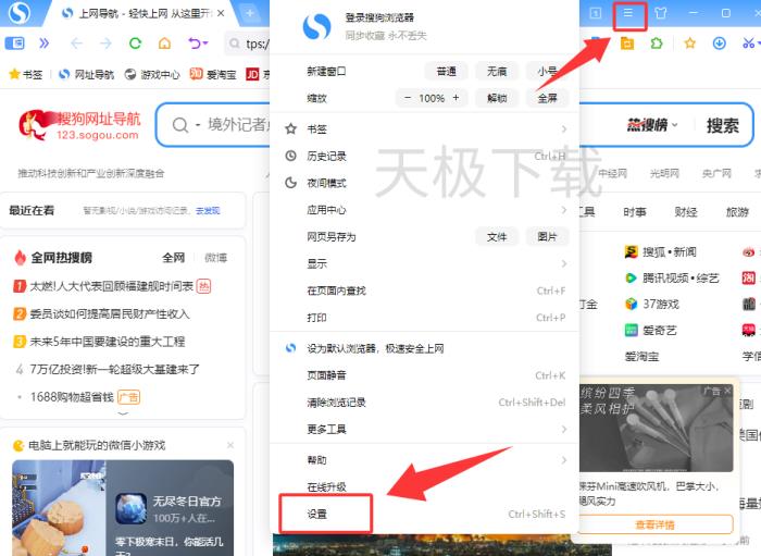 1.打开搜狗浏览器,点击右上角的【菜单】,选择【设置】。