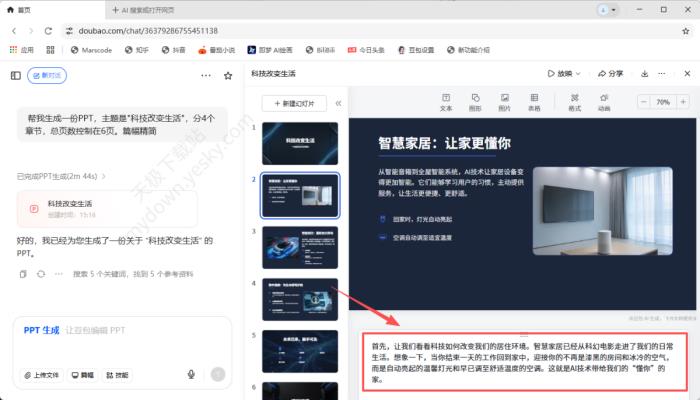 3、耐心等待PPT生成后,在右侧即可预览其最终效果。同时,每页PPT下方配有对应的文字讲解,这些内容既可作为展示时的讲解词,也能帮助我们更直观地理解PPT的核心含义。