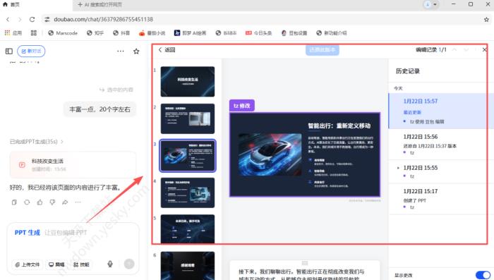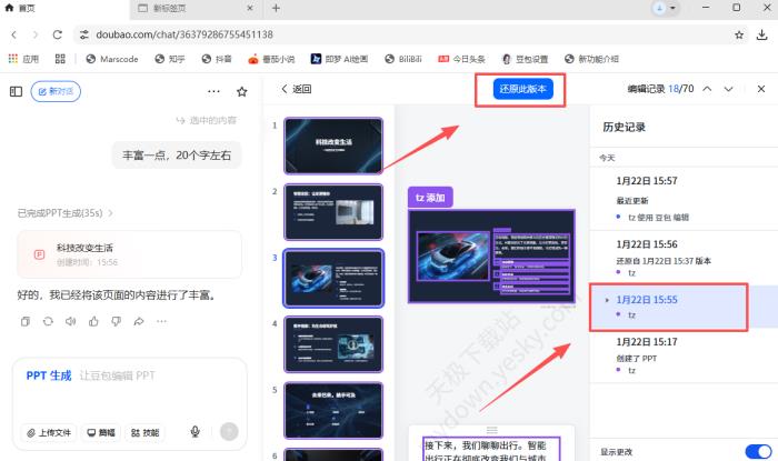 2、在这里即可查看豆包从生成PPT到每一次修改的历史记录。