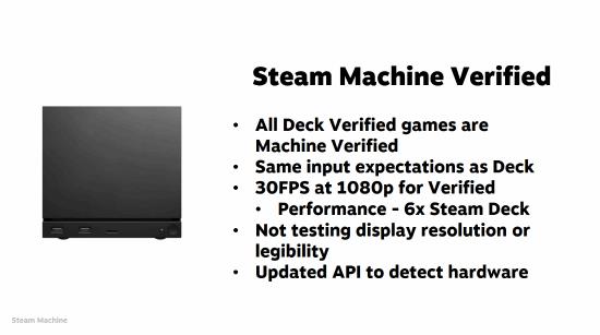 首先是Steam Machine。Valve表示,有一个非常简单的条件:如果游戏已经通过Steam Deck认证,那么它自然符合Steam Machine的认证。当然,还有一些额外的附加条件:由于Steam Machine内部的硬件性能是Steam Deck的数倍,因此性能认证的目标是至少要在1080p分辨率下达到30帧。