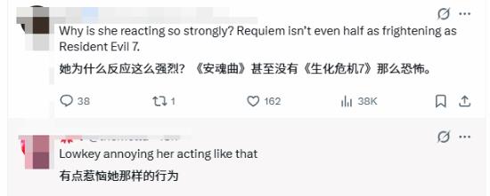 不过,安吉拉的这种表现也引发了部分网友的质疑。有网友表示,《生化危机9》其实并不是一款主打惊吓的恐怖游戏,更何况安吉拉作为参与配音和动捕的演员,已经看过游戏剧本,没必要表现得如此害怕。
