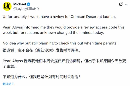 知名内容创作者 @LegacyKillaHD 近日发文表达了无奈。他表示,开发商 Pearl Abyss 本已承诺在本周提供评测用的抢先体验码,但官方却在未说明任何原因的情况下突然“变卦”,导致他无法在游戏首发时同步推出深度评测。
