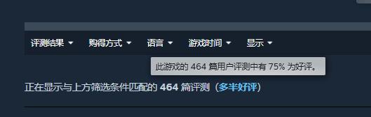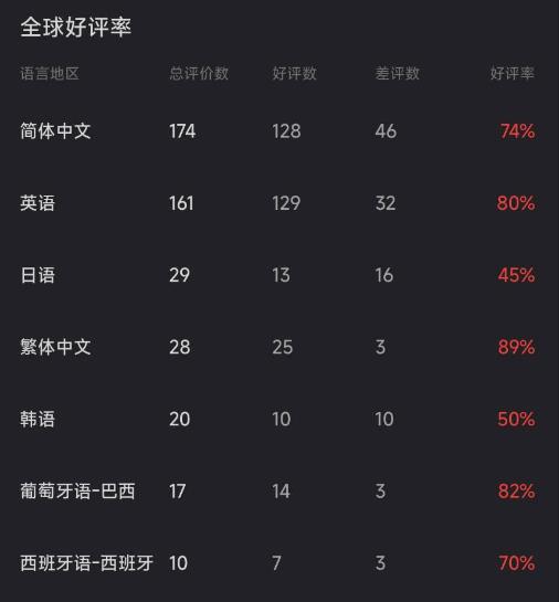 在现有的464条评价中,游戏好评率为74%。其中,简中地区评论数最多,共计174条,好评率为74%;英语地区紧随其后,共161条,好评率为80%。值得注意的是,日语和韩语地区的评价虽然数量不多,但好评率却出奇地低,仅有45%和50%。