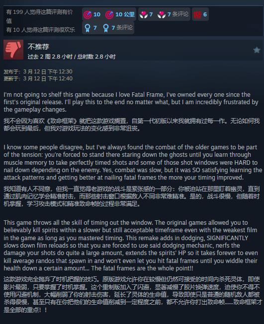Team Ninja操刀的《零:红蝶重制版》已经登上Steam开售了,国区卖298块。目前看玩家评价,拿了个多半好评。不少玩家觉得,战斗这块儿难度可以再调调。