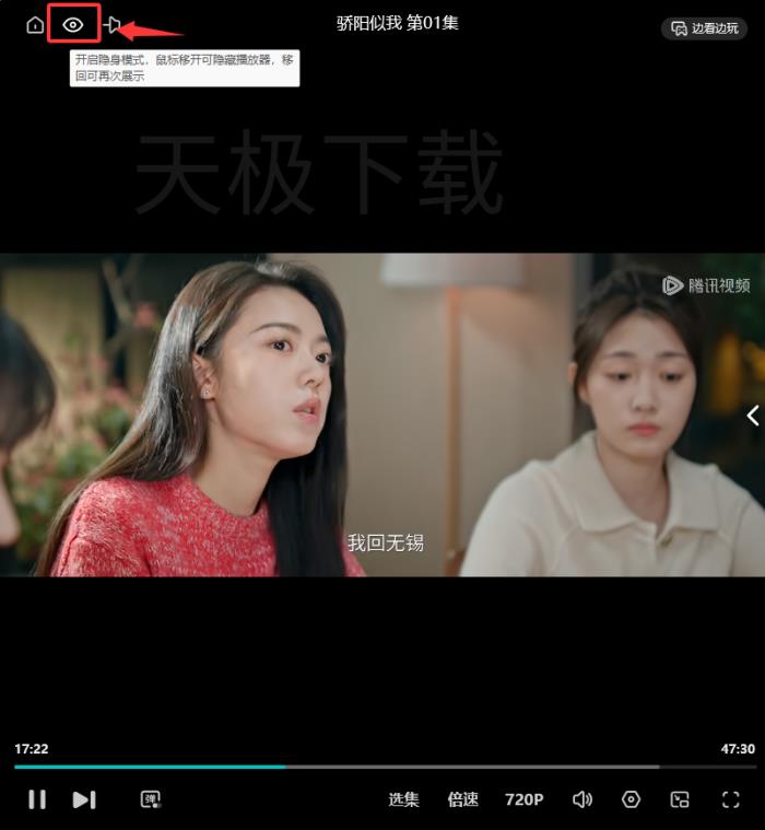 2.点击视频播放页面左上角的【眼睛】图标,开启隐身模式。