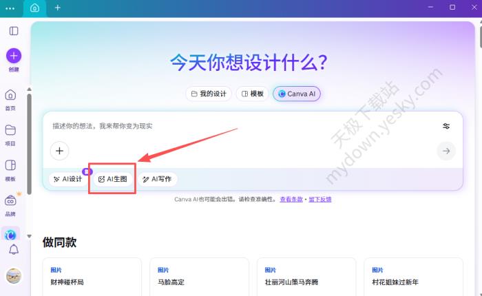 今天来说一下Canva最新电脑端版本2026 V1.121.0里的AI绘图功能。这项功能特别适合那些不擅长画画但又想快速出效果的人,只要输入关键词,AI就能帮你生成图片。操作也很简单,直接在设计界面找到AI绘图工具,输入描述,比如“蓝天白云下的森林”,然后根据需求调整画布尺寸和风格,就能得到一张符合要求的图片。如果需要修改,还能通过设置颜色、细节等选项进一步优化。