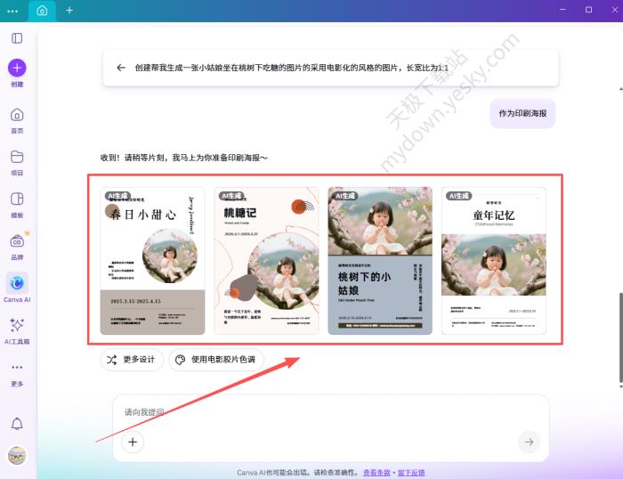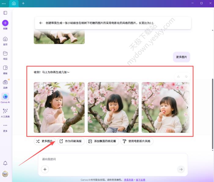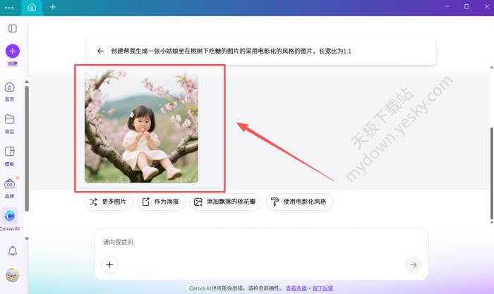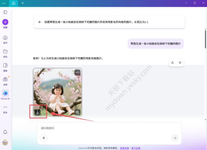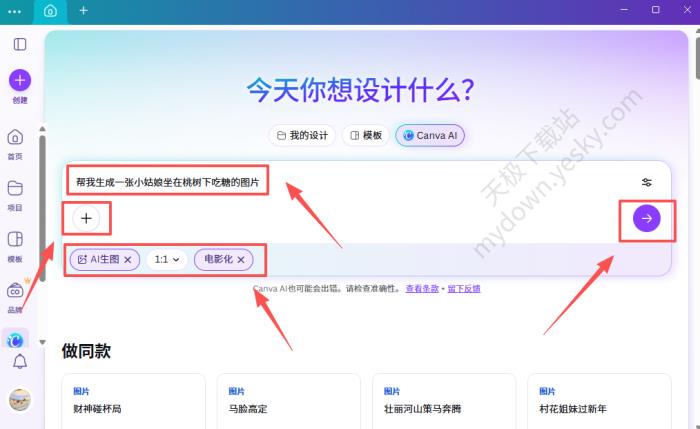 3、在对话框内输入要求【比如:帮我生成一张小姑娘坐在桃树下吃糖的图片】,在下方选择生成的图片比例【1:1/3:4/4:3】,选择风格【3D渲染/动态/素描·黑白/时尚/散景/HDR/电影化概念/插画/电影化/微距/素描·彩色/极简风/创意/神秘等】,点击对话框中【 】还支持上传文件或者从Canva可画添加。完成设置后点击箭头即可。