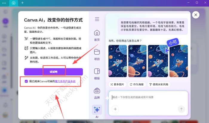 4、第一次使用Canva可画AI功能要注意勾选下方【我已阅读Canva可画的魔力系列产品条款】,点击【试试吧】。