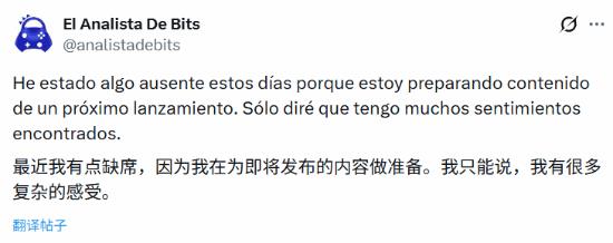 该博主在社交平台发文称:“这几天我有点沉寂,因为正在为即将发布的新作准备内容。我只能说,我现在心情非常复杂。”