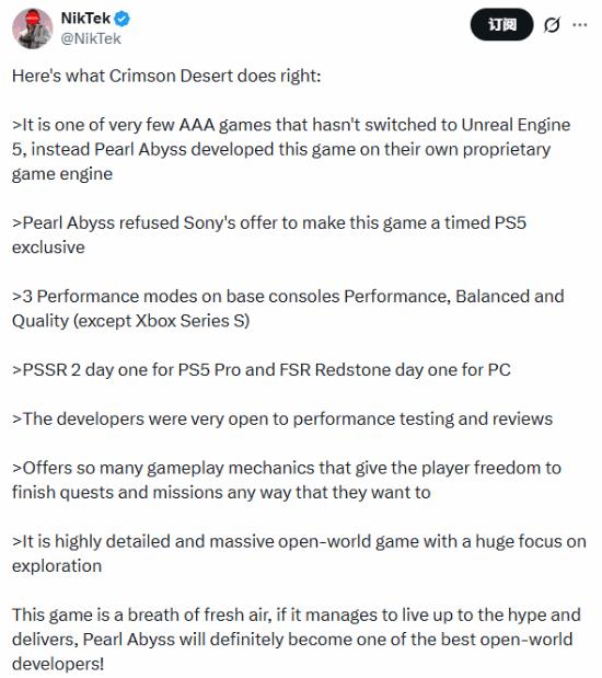 今日,游戏博主@NikTek发文总结《红色沙漠》优点,称赞其为业界清流,“如果它能不负众望,成功兑现承诺,Pearl Abyss必将跻身顶尖开放世界开发商之列!”