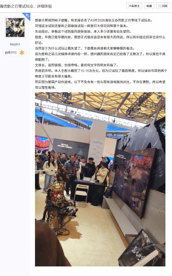 在上海AWE2026的活动上,海信搞了个《影之刃零》的线下试玩。有玩家“MagiIIIX”试玩后说了说感受,结果在玩家圈里讨论得挺热闹。