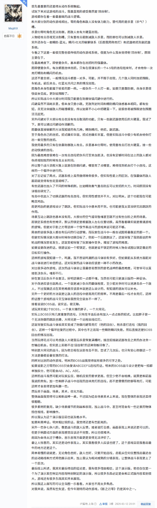 试玩者最后强调,这仅为特定演示版,与正式版必有巨大差异,虽略有失望,但《影之刃零》仍是其2026年最期待的动作游戏之一。