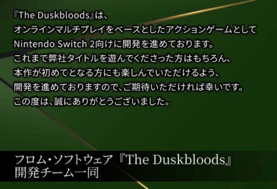 而FS社对此也发表了感言:《黄昏之血》是一款基于在线多人游玩的动作游戏,目前正在针对Nintendo Switch 2平台进行开发。