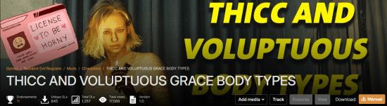 该MOD名为 “THICC AND VOLUPTUOUS GRACE BODY TYPES”,主要为格蕾丝的服装模型加入更丰满的身材比例,同时尽量保持整体视觉风格的自然感。