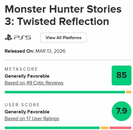 与此同时,游戏还获得了不俗的玩家打分,截至发稿,《怪物猎人物语3:命运双龙》在M站用户评分为7.9分。