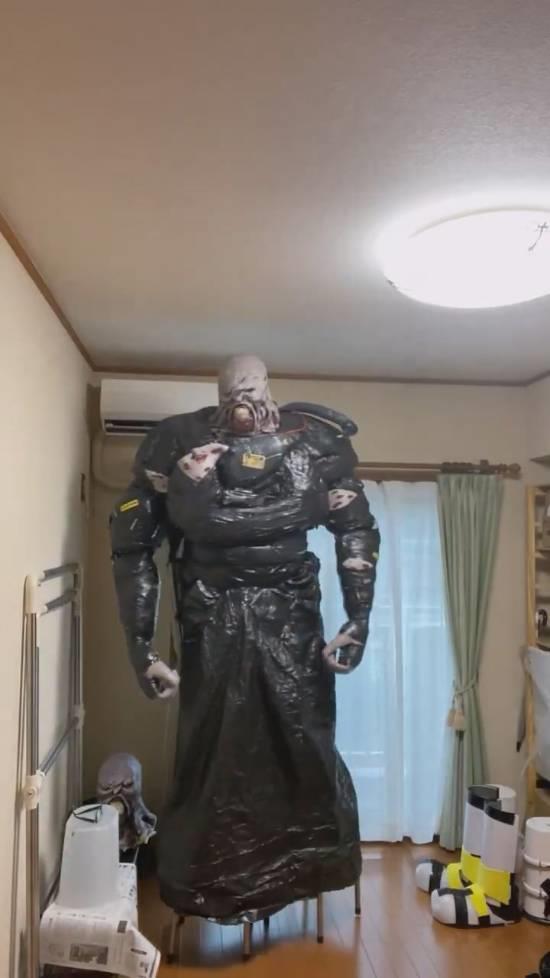 从视频来看,这套COS几乎完全是通过胶带与各种自制材料制作出来,却能达到如此还原的效果,简直堪称“神级手工”。即便是生化危机的老玩家,初看也可能会被吓一跳,尤其是配合动作表演时,那种诡异感更是相当到位。有人打趣说:“如果站在小孩的视角,恐怖程度至少能打8.5/10,不过这种用心程度真的值得尊敬。”