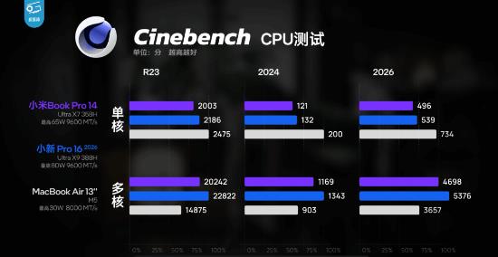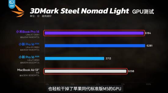 极客湾还指出,虽然Xiaomi Book Pro 14定位轻薄本,但凭借Panther Lake架构良好的能效表现,其多核性能与满血版388H差距并不大,甚至在测试中能够轻松超过MacBook Air M5的多核表现,整体性能表现相当亮眼。