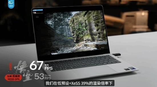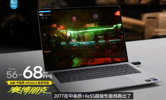 在游戏测试方面,该机同样有不错发挥。例如在黑神话:悟空中,以3.1K分辨率、低画质 XeSS 39%设置运行时,帧率可以稳定在60FPS;而在赛博朋克2077中,使用3.1K分辨率、中画质 XeSS 2.0超级性能模式,则跑出了68FPS的成绩。