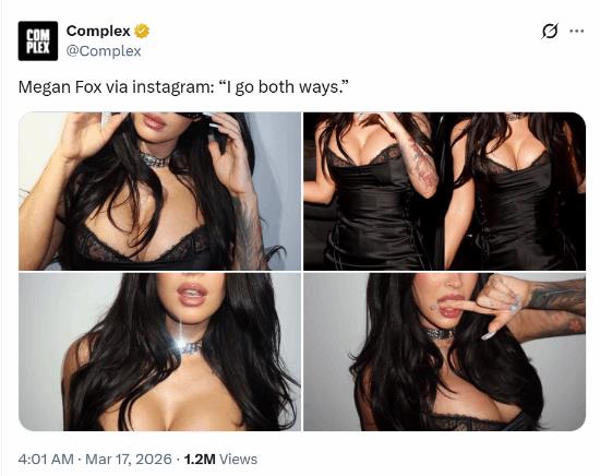 梅根福克斯在Instagram上晒出一组性感自拍,并自信写道:“我男女通吃。”