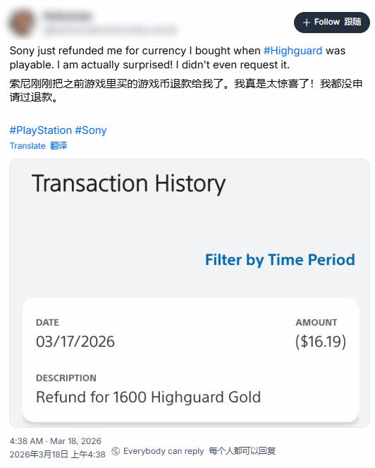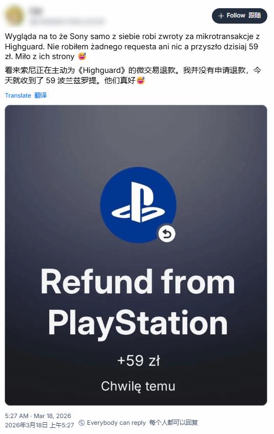 另一位玩家也表示:“看起来索尼正在主动为《巅峰守卫》的内购退款。我没有提交任何申请,今天却收到了59波兰兹罗提的退款。”