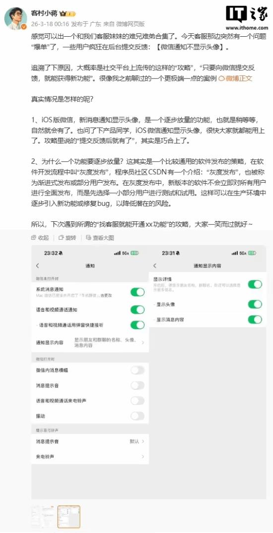 @客村小蒋 还提到,已向产品部的同事确认,iOS 微信通知显示头像功能很快将覆盖所有用户。同时提醒用户,类似“找客服就能开通功能”的网络传言并不属实,建议用户理性看待。