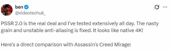 他表示,自己经过一整天的测试后认为:“PSSR 2.0确实非常强,之前那种明显的颗粒感噪点和不稳定的抗锯齿问题已经被修复,画面效果几乎接近原生4K。”
