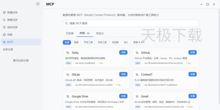 ●主流服务一键接入:内置搜索、开发工具、办公协作、浏览器自动化等六大类MCP服务市场,支持Tavily搜索、GitHub、Notion等15 主流服务一键配置,也可自定义接入企业内部系统与私有数据源。