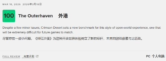 外媒The Outerhaven给《红色沙漠》满分评价,称其“重新定义了开放世界的标准,后续作品很难超越。”