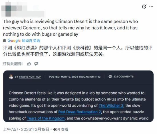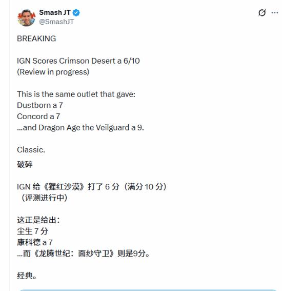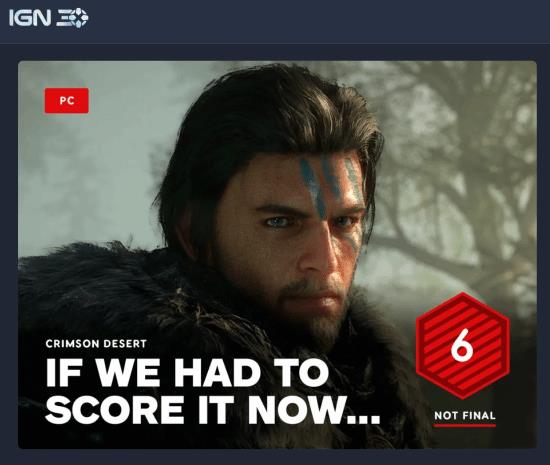 本次评分争议焦点集中在 IGN 的6分评价。该分数不仅远低于一众媒体的9.5分等高分评价,甚至低于此前口碑不佳的《星鸣特攻》《巅峰守卫》,被玩家认为 “严重偏低”。更有网友发现,为《红色沙漠》打分的编辑,与此前评测《星鸣特攻》的编辑为同一人,进一步加剧玩家对评分客观性的质疑。