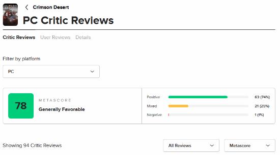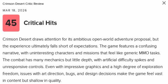 唯一的一条差评来自Critical Hits,给出了45/100的评价。他们认为《红色沙漠》“凭借其雄心勃勃的开放世界冒险设定吸引了不少关注,但整体体验最终未能达到预期。游戏的叙事令人困惑,角色缺乏吸引力,任务设计也更像是千篇一律的MMO跑腿内容。”