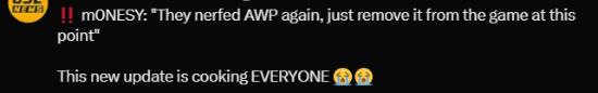 被国内玩家誉为“孩神”的猎鹰明星狙击手m0NESY也直言不满:“他们又削AWP了,干脆直接删掉算了。”