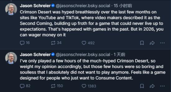 在媒体评分与玩家体验逐渐解禁后,《红色沙漠》成为近期最具分歧的作品之一:有人盛赞其野心与规模,也有人直言体验乏味。而Schreier显然属于后者。