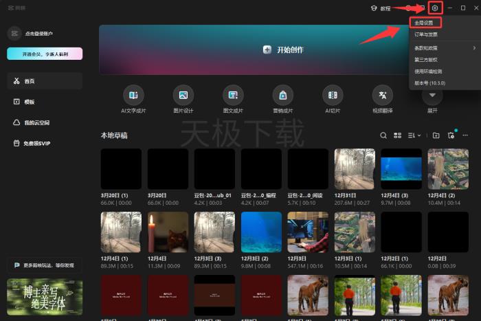 1.打开剪映,点击右上角的【设置】,点击【全局设置】。