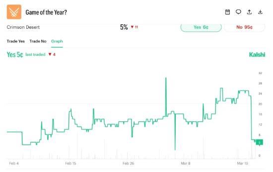 3月20号有这么个消息,热度一直很高的《红色沙漠》媒体评分一出来,口碑这块儿就有点扛不住了。最开始那波评价有好有坏,弄得预测平台Kalshi上的数据来了个大反转。现在看它和《GTA6》争年度最佳,胜算大概就剩5%了。