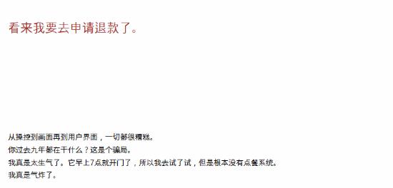 “这游戏让我都想退款了。从操作到图形界面,全都烂透了。开发这么多年都在干什么。早上7点就开始玩,还没任务引导,真是火大。”