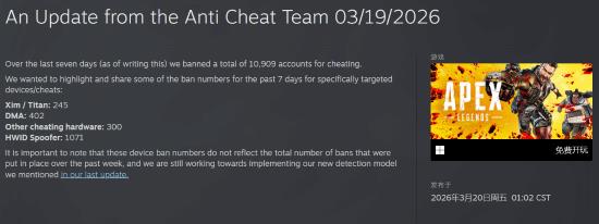 官方@respawn_bean公布了详细封禁数据:过去七天共封禁10909个账号,其中Xim/Titan设备245个,DMA设备402 个,其他作弊硬件300个,HWID Spoofer硬件ID欺骗1071个。