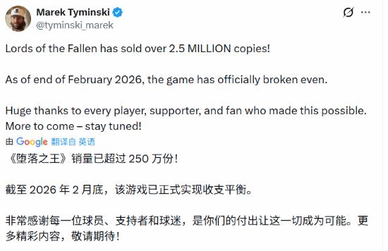 CI Games 首席执行官 Marek Tyminski 在社交平台上兴奋地表示,截至 2026 年 2 月底,游戏已正式实现收支平衡并开始盈利。他向所有支持这款作品的玩家致以最深切的谢意,并预告了更多精彩内容的到来。