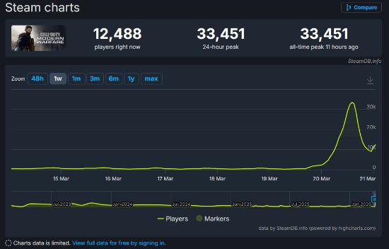 《使命召唤16:现代战争》于Steam平台迎来了前所未有的热度。受益于Steam春季特卖,这款经典作品以仅39.9元的超低价促销,在过去24小时内同时在线玩家数飙升至历史最高点。
