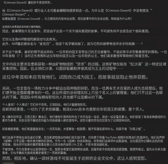 离职员工透露,《红色沙漠》最初的设定与现在大相径庭。真正玩过这款游戏,或者已经通关的玩家,大概多少都能隐约感觉到这一点。因为直到发售前,游戏的故事都没有真正定下来,所以也没有像样的剧情预告。
