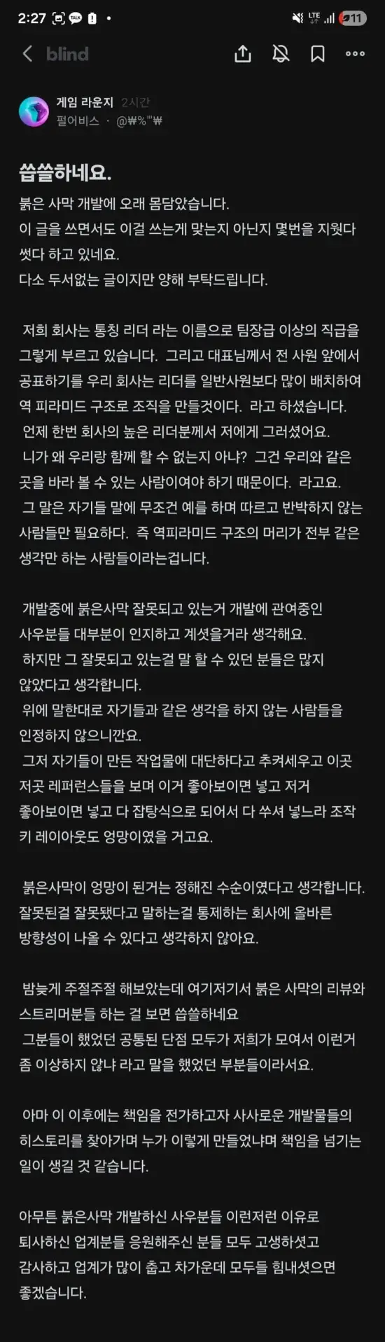 据悉,这些帖子发布于Blind平台的游戏行业论坛。该平台仅对通过公司邮箱认证的从业者开放。爆料中,一篇来自已离职并入职Nexon的前员工,另一篇则来自在职开发者,且评论区有多位员工表示认同。