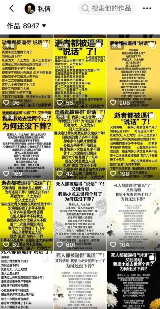 家属方随即强硬否认,称“未下葬”“停棺十年”均为造谣诬陷,已固定证据准备起诉。家属透露,梁小龙去世后全家人一直沉浸在悲痛中,账号发布大量私密内容已对家人造成严重伤害。