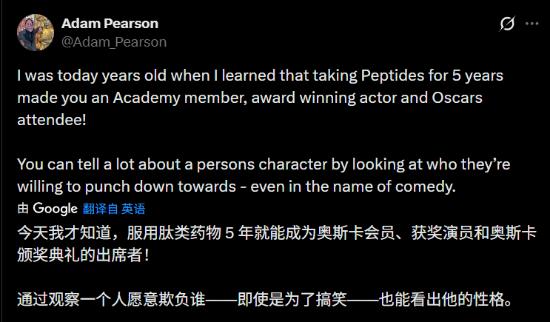 该喜剧演员曾晒出皮尔森亮相奥斯卡红毯的照片,配文称:“我和哥们儿吃了五年肽类产品后变这样。”皮尔森回应道:“我今天才知道,吃五年多肽能成为奥斯卡会员、获奖演员,还能走红毯……从一个人愿意拿谁开涮,就能看出他的品性——哪怕打着喜剧的旗号。”