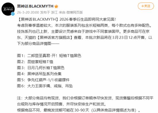 新品将在京东、天猫黑神话官方旗舰店上架,3月23日12时开售,大部分商品有现货,将按订单顺序发货。官方提示,现货售罄后开启预售,因品类不同,最晚发货期30-90天,具体以商品详情为准。