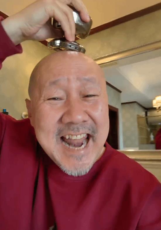 视频里,腾格尔一边哼着歌,一边拿着剃须刀,在原本就光秃的头顶上来回打理,画面十分欢乐。