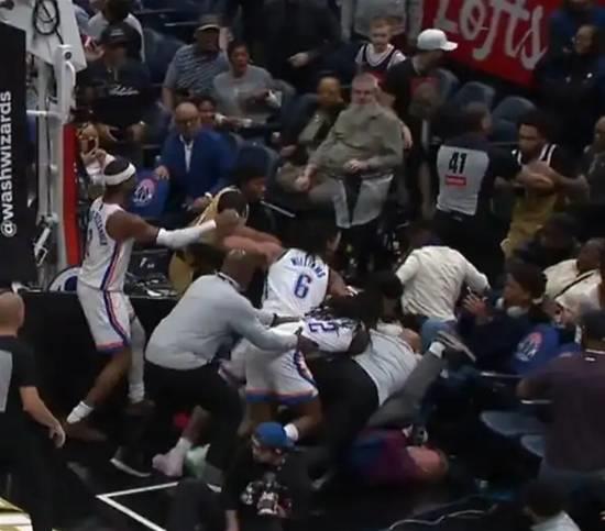 2026年3月22日,NBA常规赛雷霆客场对阵奇才的比赛中,第二节死球期间,两队球员发生激烈冲突,场面陷入混乱。
