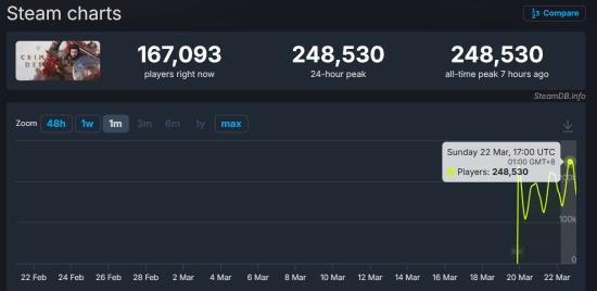 根据 SteamDB 的最新监测数据显示,本作在过去 24 小时内迎来了发售以来的最高光时刻:历史最高在线玩家数已攀升至248,530人。