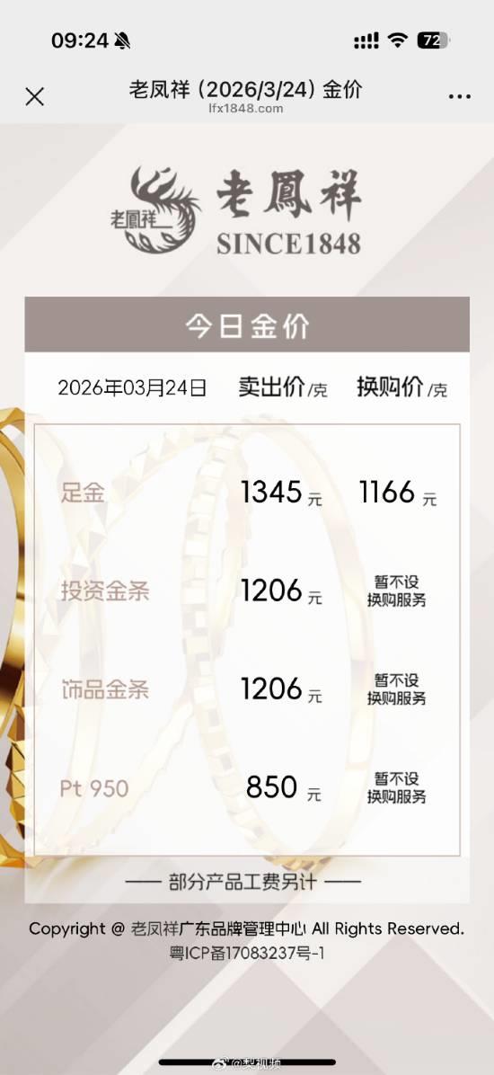 3月24日,现货黄金失守4340美元/盎司,截至发稿报4358.230美元/盎司。 老凤祥足金饰品报1345元/克,较前一日1374元/克跌去29元。