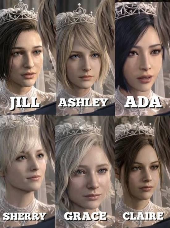 图片展示了吉尔、艾什莉、克莱尔、艾达王、雪莉以及格蕾丝身着婚纱的动人瞬间。